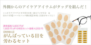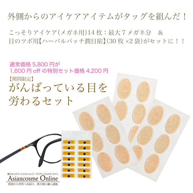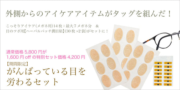 『こっそりアイケア(メガネ用)』と『目のツボ用【ハーバルパッチ潤目貼】』がお得なセットになって登場です。
